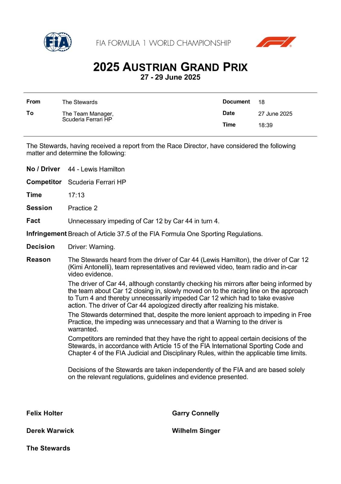 gp austriaLewis Hamilton se l'è cavata con un 'warning' dopo essere finito sotto investigazione dai commissari per un impeding ai danni della Mercedes di Kimi Antonelli in Curva 4 nelle Prove Libere 2 del GP d'Austria. "Non l'ho visto...", ha detto il ferrarista via radio, scusandosi immediatamente con il pilota italiano. Guarda il video con l'episodio. Il weekend è live su Sky e in streaming su NOW