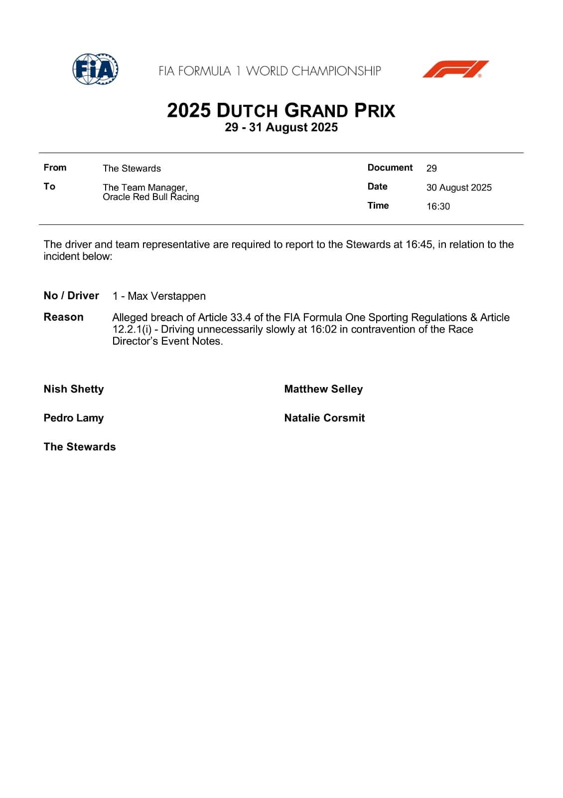 GP OLANDAIl pilota della Red Bull e i rappresentanti del team convocati dai commissari al termine della qualifica per guida eccessivamente lenta in fase di rientro ai box. Nessuna sanzione la decisione della FIA su una presunta violazione degli articoli 33.4 e 12.2.1 (i) del Regolamento Sportivo. Tutto il fine settimana della F1 è come sempre live su Sky e in streaming su NOW