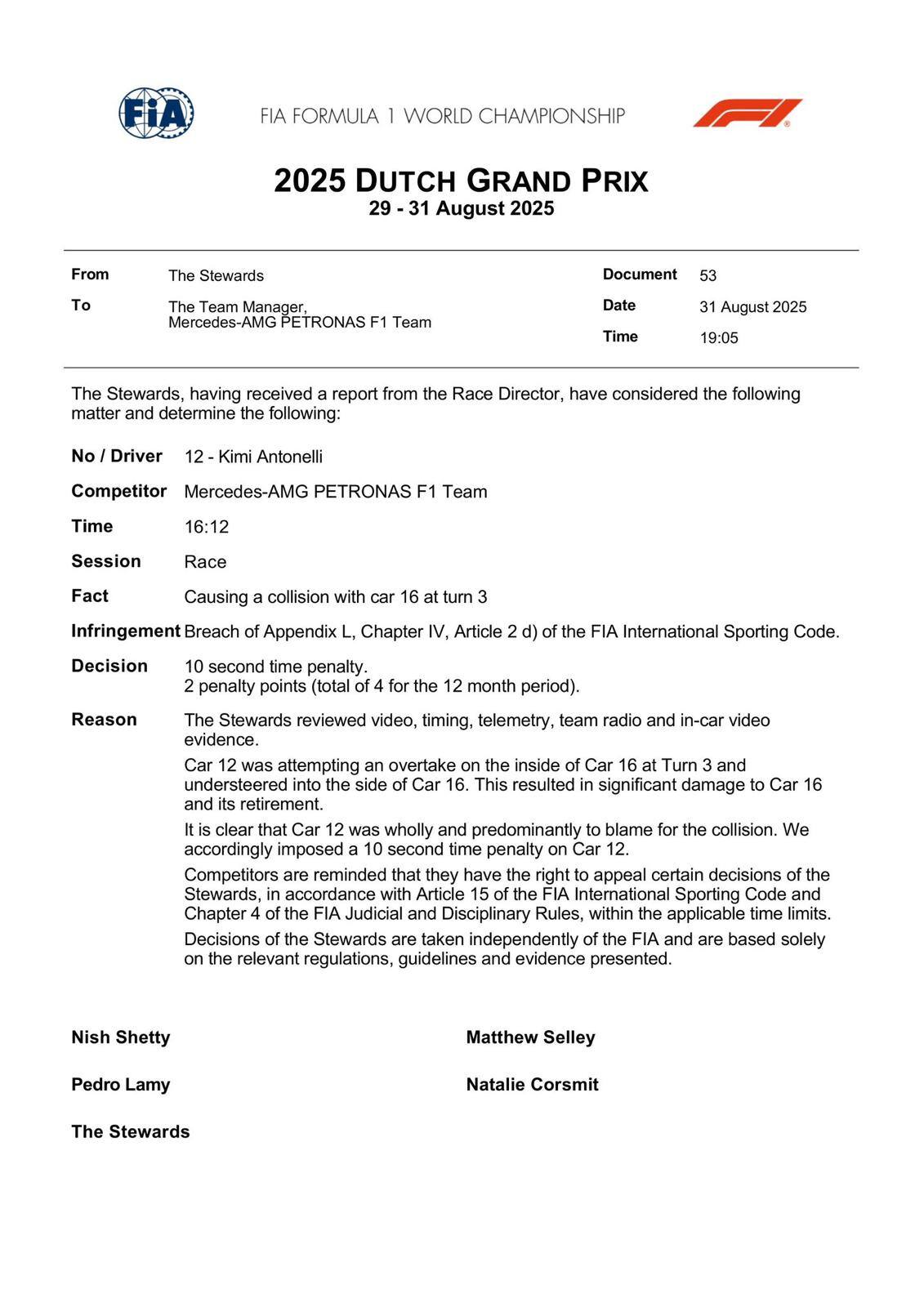 F1, GP Olanda: per Antonelli 2 punti sulla patente per l'incidente con Leclerc