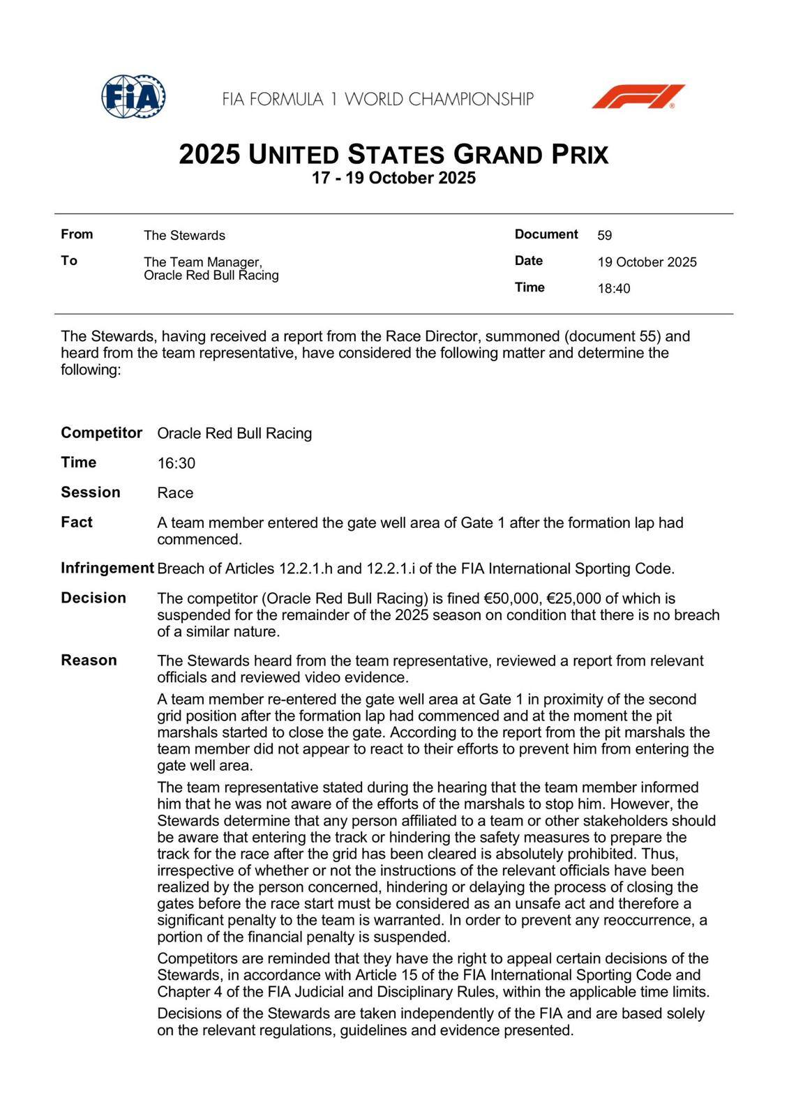 IN TEXASRed Bull investigata e poi multata dai commissari per mancato rispetto dell'articolo 12.2.1.i del Codice Sportivo Internazionale FIA, mentre la RB21 era in griglia di partenza. Tutto nasce da una segnalazione della McLaren: qui i dettagli dell'episodio prima del via della gara texana. La F1 torna in Messico dal 24 al 26 ottobre: live su Sky e in streaming su NOW