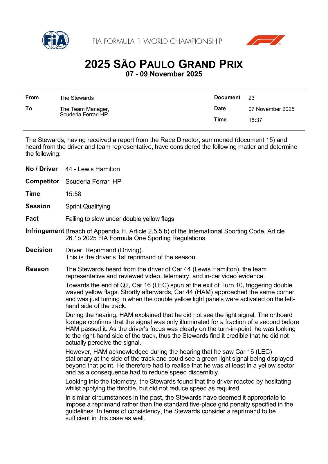 Reprimenda per Lewis Hamilton dopo essere finito sotto investigazione al termine delle qualifiche Sprint del GP del Brasile. L'episodio esaminato dai commissari era nato da un testacoda di Charles Leclerc, che nel finale di SQ2 (seconda sessione della qualifica Sprint) aveva perso il controllo della sua Ferrari nell'ultimo tentativo, provocando l’esposizione della doppia bandiera gialla. Hamilton era transitato poco dopo nella stessa zona, spingendo per cercare un ultimo giro utile, senza rallentare a sufficienza dato il regime di bandiere gialle. Scongiurato il rischio di una penalità nella griglia, per lui solo una reprimenda e undicesima posizone confermata al via.