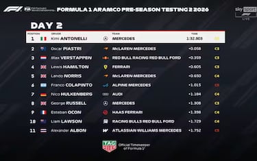 Un favoloso Kimi chiude al comando la penultima giornata di test a Sakhir: il pilota della Mercedes ha girato in 1:32.803. Secondo Piastri (si ferma nel finale) e terzo Verstappen. Hamilton quarto con la Ferrari, qualche problema al mattino per la SF-26. Fatica ancora tanto l'Aston Martin: Alonso si pianta e non rientra più.
