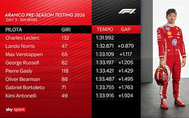 Bandiera a scacchi sui test in Bahrain, con una solida Ferrari che chiude al primo posto con Leclerc in 1:31.992: è il miglior tempo di tutte le prove precampionato. Secondo Norris, poi Verstappen e Russell. Bene Antonelli al mattino, anche se la sua attività in pista è terminata per un problema alla Mercedes.Tanta fatica ancora per Aston Martin e Cadillac.