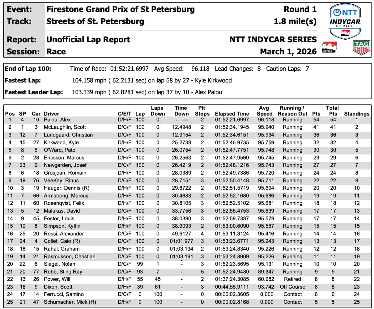 Nuova stagione, stessa sinfonia: Alex Palou vince il Gran Premio di St. Petersburg della IndyCar, iniziando la rincorsa verso il quinto titolo con una prestazione strepitosa. In attesa per i primi 38 giri, lo spagnolo di Chip Ganassi Racing ha risparmiato carburante seguendo il poleman Scott McLaughlin e Marcus Ericsson. Allungando lo stint di ben tre giri, Palou ha lasciato i box scavalcando entrambi, in linea con quanto fatto nel GP dell’anno scorso, involandosi poi verso un trionfo mai messo in discussione. Il 20° successo della carriera è arrivato con ben 12,4” di vantaggio su McLaughlin, bloccato nell’ultimo stint da un Kyle Kirkwood capace di salire virtualmente sul podio anticipando il secondo pit stop di quattro giri. Questo, per il pilota Andretti è però diventato uno svantaggio nei giri conclusivi, quando sia la Penske di McLaughlin sia la McLaren di Lundgaard (partito 12°) hanno avuto la meglio. Tuttavia, a strada libera nessuno dei due ha nemmeno immaginato di puntare ad Alex Palou, che indisturbato ha tagliato il traguardo vincendo per il secondo anno di fila a St. Petersburg.
