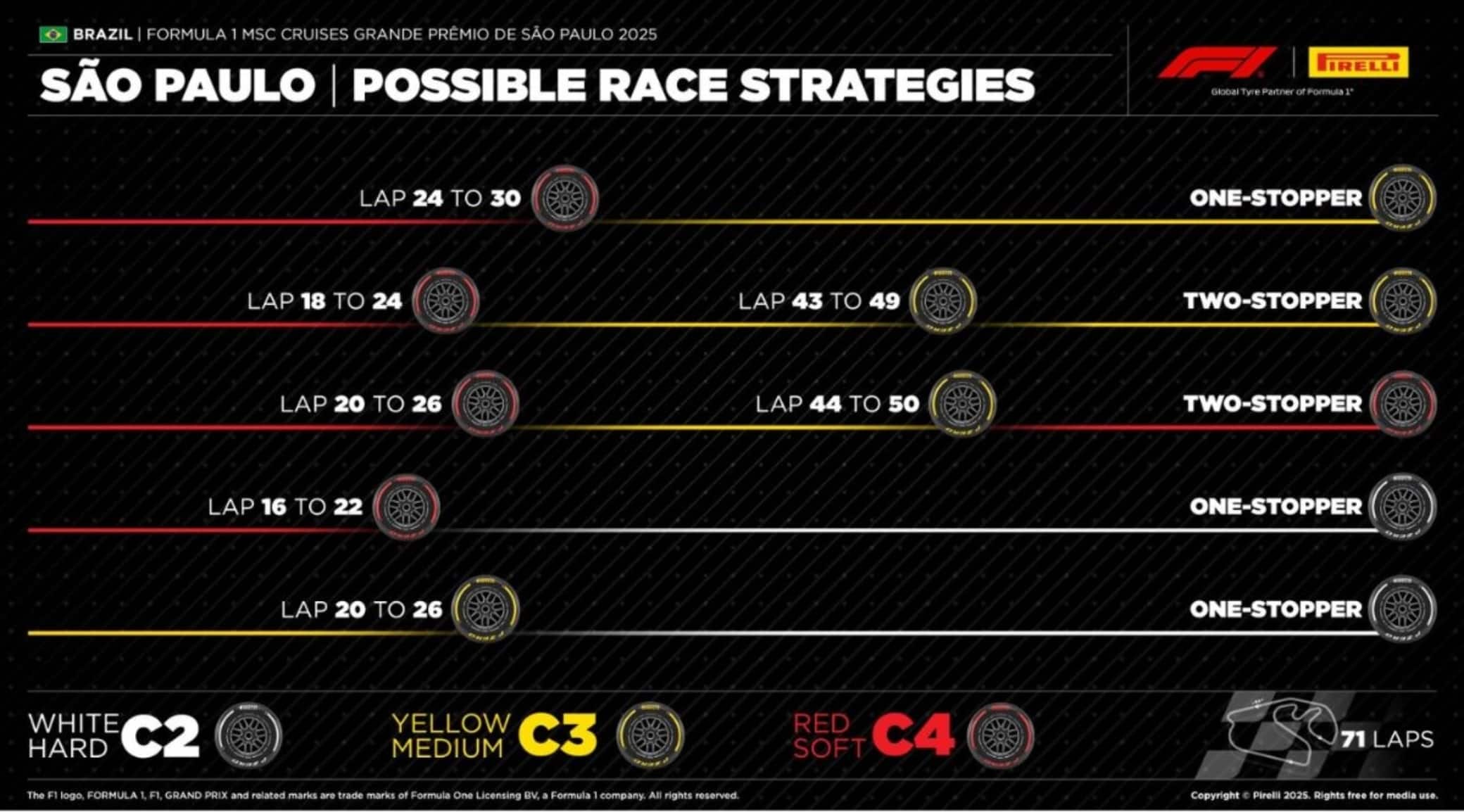 Con i dati forniti da Prelli, qui le opzioni per le strategie che i team potrebbero adottare durante la gara a Interlagos. La gara di San Paolo è in diretta su Sky e in streaming su NOW