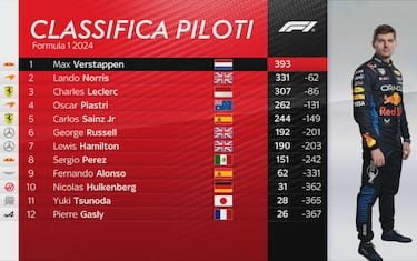 Nella classifica del Mondiale Verstappen è in testa con 393 punti, 62 in più di Norris (McLaren). Mancano solo 3 GP al termine del campionato mancano, compreso quello di questo weekend a Las Vegas, e una Sprint (30 novembre in Qatar)