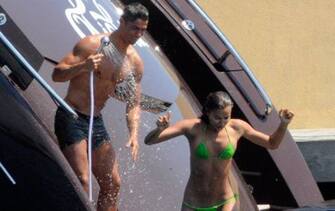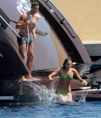 La modella e il numero 9 del Real Madrid scherzano prima di tuffarsi in acqua