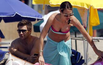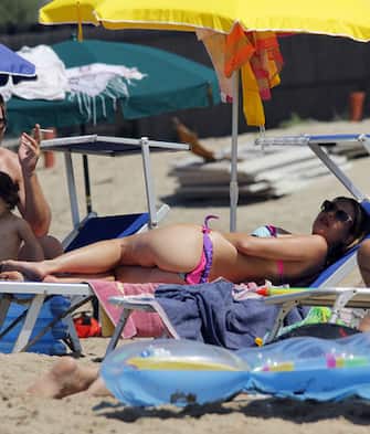 La showgirl, che ha mostrato un fisico scolpito, è stata fotografata sulla spiaggia della località laziale insieme ai figli Cristian e Chanel -