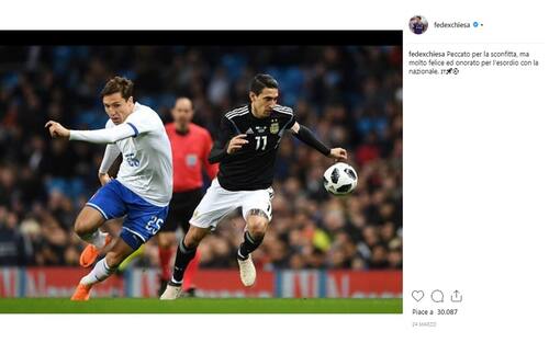 Federico ha esordito in Nazionale il 24 marzo di quest'anno nell'amichevole con l'Argentina all'Etihad Stadium di Manchester (foto da Instagram)