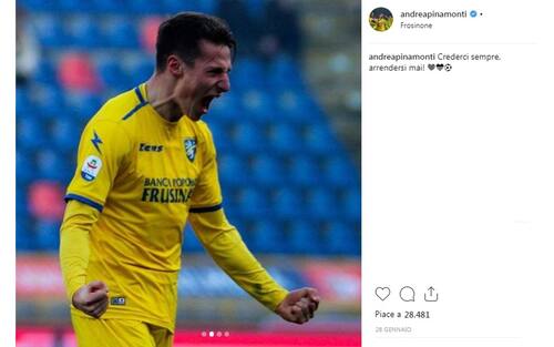 Con la maglia del Frosinone, il 28 ottobre, Pinamonti ha segnato il primo gol in Serie A nella partita vinta 3-0 sul campo della Spal. Si è ripetuto il 9 novembre, realizzando la rete del pari contro la Fiorentina e nel 4-0 in casa del Bologna (foto da Instagram)