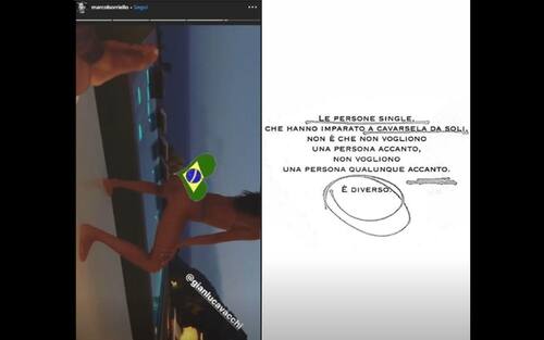 Alcune stories di Borriello: da una parte il "twerking" misterioso... con un cuoricino tutto brasiliano; dall'altra... una frase sull'essere single (foto da Instagram)
