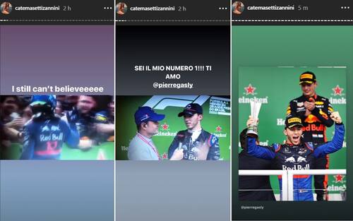 È tutto vero: in Brasile il francese della Toro Rosso Pierre Gasly ha conquistato il primo podio della sua carriera e il secondo posto di Interlagos (alle spalle di Max Verstappen) ha fatto impazzire di gioia la fidanzata Caterina, studentessa bolognese. "Le parole non possono spiegare quanto sia orgogliosa di te - ha scritto su Instagram - ti amo tantissimo. Ti aspetto a casa per festeggiare questo straordinario P2!"