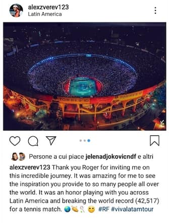 Nella capitale messicane, a Plaza de Toros, erano 42.517 gli spettatori a seguire il match esibizione tra Federer e Zverev vinto in tre set dallo svizzero (3-6, 6-4, 6-2). Nuovo record assoluto di pubblico per una singola partita di tennis (foto da Instagram)
