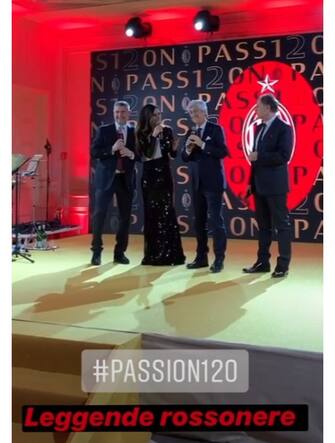Padrona di casa della festa la bellissima Giorgia Palmas, qui sul palco con alcune delle grandi leggende rossonere presenti alle celebrazioni: Franco Baresi, Gianni Rivera e Daniele Massaro (foto dal profilo Instagram del Milan)