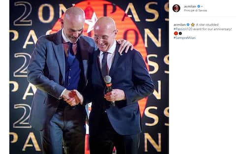 Serata magica al Principe di Savoia, teatro del party per i 120 anni di storia del Milan. Rossoneri di ieri e di oggi, come Arrigo Sacchi e Stefano Pioli (foto dal profilo Instagram del Milan)