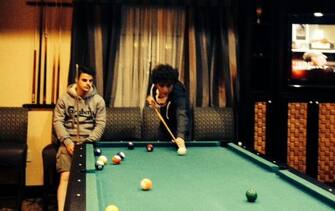 Pecco Bagnaia e Romano Fenati giocano a biliardo prima del GP di Austin, seconda prova del Motomondiale 2014 -