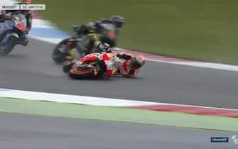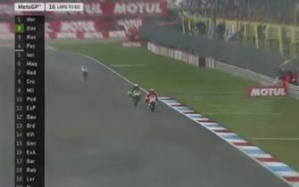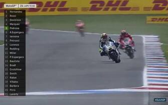 Pronti via, cadono alcuni dei protagonisti della prima parte di gara: Pedrosa e soprattutto Danilo Petrucci, Andrea Dovizioso e Valentino Rossi, che al momento dello scivolone, era in testa alla gara (Foto Twitter) -