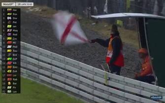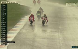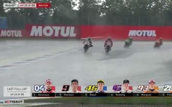 Al 15esimo giro (sui 26 previsti), la direzione gara espone la bandiera rossa per la troppa pioggia. Dovizioso, Petrucci e Rossi l'ordine di "arrivo" parziale (Foto Twitter) -