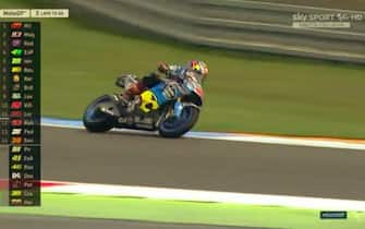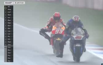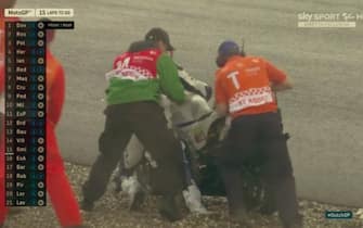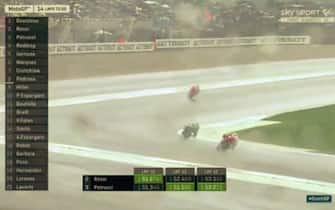 A 15 giri dalla fine, con la pioggia insistente, Hernandez perde il controllo della sua moto e finisce fuori pista: nessuna conseguenza per lui, autore comunque di una gara incredibile (Foto Twitter) -
