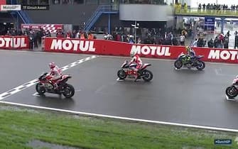 Storico il successo di Jack Miller, che vince per la prima volta nella classe regina. Da applausi anche il quinto posto di Andrea Iannone, partito ultimo, caduto e autore di una grande gara nella piscina di Assen (Foto Twitter) -