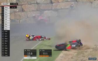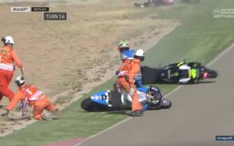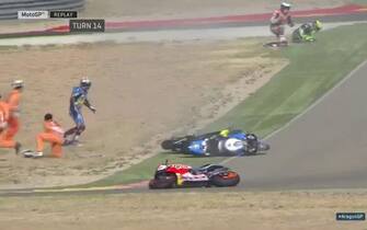 Tutti giù per terra: le terze libere del GP di Aragon non hanno risparmiato nessuno. Una pista scivolosa e insidiosa ha provocato spettacolari cadute, che hanno coinvolto i big della MotoGP (Foto Twitter)
