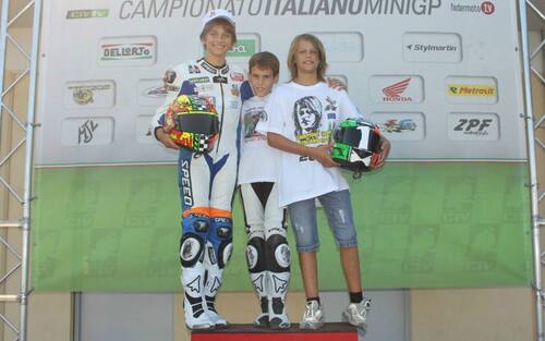 Nel biennio 2010-2011 Stefano Manzi conquista due titoli consecutivi nel Campionato Italiano MiniGP classi 50cc e 70cc. In questa foto, stagione 2011, festeggia il titolo della 70cc in buona compagnia: Nicolò Bulega (alla sua sinistra) e Luca Marini (alla sua destra), campioni rispettivamente della 50cc e 80cc -