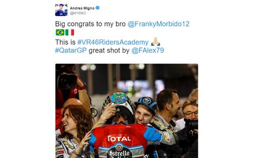 Concluso il primo GP della stagione, Andrea Migno su Twitter ricorda la straordinaria impresa dell'amico Franco Morbidelli, per la prima volta vincitore nella classe Moto2: questo è far parte della VR46 Riders Academy... -