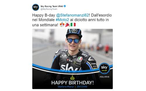 Mercoledì 29 marzo: Stefano Manzi diventa maggiorenne! Sull'account Twitter ufficiale dello Sky Racing Team VR46 non manca chiaramente il messaggio di "Buon Compleanno" da parte di tutta la squadra -