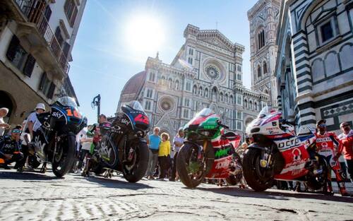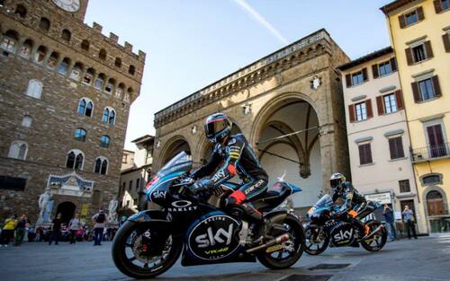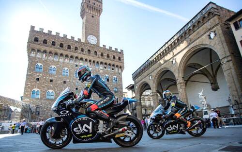 Arrivare in moto in Piazza della Signoria a Firenze? Possibile! Questo è quanto accaduto nel Media Event per promuovere il Gran Premio d'Italia al Mugello, protagonisti i piloti dello Sky Racing Team VR46 Francesco Bagnaia (Moto2) ed Andrea Migno (Moto3) -