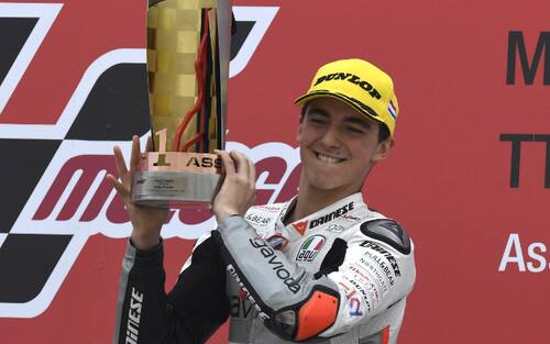 Il 26 giugno 2016 arriva per Bagnaia la prima vittoria: trionfa al TT Circuit Assen davanti a Fabio Di Giannantonio e Andrea Migno (Sky Racing Team VR46) -