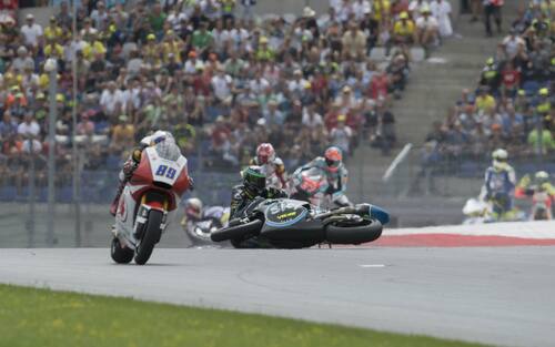 Nel finale, una volta conquistata la seconda posizione, Andrea Migno finisce a terra alla prima curva: risalirà in sella per concludere al 21° posto -