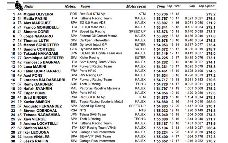 Solo 21 millesimi separano Pasini dalla pole position di Miguel Oliveira, ma sul passo il riminese c’è. Al suo fianco Alex Marquez, ripresosi in fretta dall’incidente di Misano. Quarto a un decimo Franco Morbidelli, che si tiene alle spalle Thomas Luthi. Quinto Simone Corsi, dodicesimo Bagnaia, caduto a fine turno
