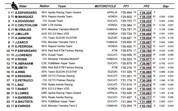 Il pilota più veloce in assoluto è stato Aleix Espargaro su un’Aprilia che continua la sua crescita gara dopo gara ma il pilota che più ha impressionato nella prima giornata di prove libere è stato Marc Marquez. Non solo perché è stato il più veloce nella prima sessione mentre nella seconda ha pagato un ritardo di soli 5 millesimi da Espargaro, Marquez impressione perché ha imposto un ritmo altissimo dal primo all’ultimo giro in tutte le condizioni. Nessuno è andato forte come lui anche con un abbinamento gomma dura anteriore-morbida posteriore del tutto inedito per gli altri.