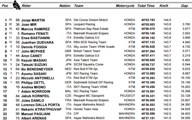 Jorge Martin riesce finalmente a vincere la sua prima gara del motomondiale alla 50° presenza e soprattutto dopo 9 pole position stagionali. A inizio gara il pilota spagnolo ha dovuto controllare Mir e Guevara che però dopo tre giri è finito in terra obbligando il campione del mondo a uscire dalla pista e a rientrare al 19° posto. A quel punto Martin non ha avuto più problemi fino al traguardo, molto più divertente la lotta per il podio.