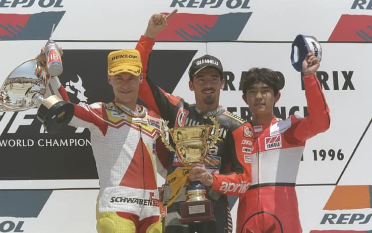9 giugno 1996: Ralf Waldmann (a sinistra), sul podio del GP di Francia con Max Biaggi (al centro ) e il giapponese Tetsuya Harada. Sul circuito di Paul Ricardcircuit a Le Beausset, il tedesco ottenne il secondo posto alle spalle dell'italiano