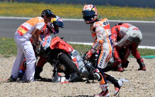 Le immagini che raccontano la dinamica del "doppio crash" che ha coinvolto al GP di Spagna sia le Ducati di Andrea Dovizioso e Jorge Lorenzo che la Honda di Daniel Pedrosa