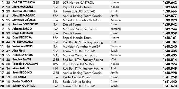 E' stato Cal Crutchlow il pilota più veloce sull'asfalto nuovo di Barcellona. Il pilota LCR Honda ha stampato il tempo migliore della mattinata, 1.39. 642. A 21 millesimi la Honda di Marc Marquez, a soli 3 millesimi dal leader del mondiale si trova il primo degli italiani, Andrea Iannone. Quarto tempo per l'Aprilia di Aleix Espargarò. La prima Yamaha è quella di Vinales (1.39.923), a due decimi da Crutchlow, nonostante uno stop prolungato per problemi con la sua M1. Dietro di lui con il sesto tempo e un ritardo di 46 millesimi c’è Andrea Dovizioso. Ottavo tempo per Lorenzo, 11° per Valentino Rossi, a quasi sei decimi dal più veloce.