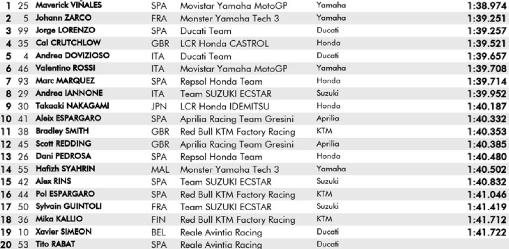 A Barcellona si rivede un super Vinales, unico pilota ad abbattere il muro del 39: con il tempo di 1.38.974 si piazza in cima alla classifica dei tempi del pomeriggio (e del giorno) spagnolo, positivo in generale per le Yamaha. Il secondo tempo è di Zarco, a due decimi dal pilota ufficiale. Rossi è sesto a sette decimi, migliorando il tempo del mattino. Tornano alla ribalta anche le Ducati, con il terzo tempo di Lorenzo - a sei millesimi da Zarco - e il 5° di Dovizioso. Crutchlow stacca il Dovi di un decimo, ma le Honda sono meno scatenate rispetto al mattino: Marquez è settimo a sei millesimi da Rossi, Perdrosa - caduto senza conseguenze nella prima sessione - 13°. Quasi un secondo di ritardo rispetto a Vinales per Iannone, incollato a Marquez in mattinata. Trascorrerà la notte in ospedale Tito Rabat, vittima di una brutta caduta con la sua moto in fiamme: non è in osservazione, non ha fratture ma ha una lacerazione muscolare al braccio sinistro, la cui entità verrà valutata domani mattina.