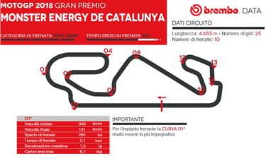 Al Montmelò i piloti della MotoGP si aggrappano ai freni 10 volte al giro per un totale di mezzo minuto pari al 28 per cento del tempo di gara. Delle 10 frenate un paio sono classificate impegnative, 3 sono di media difficoltà, le restanti 5 hanno un’incidenza leggera sugli impianti.