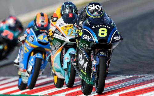 All'attacco Nicolò Bulega si trova nelle prime fasi di gara subito nel gruppo di riferimento della classe Moto3 -