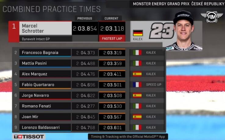 Parte bene il venerdì di Pecco Bagnaia: terzo tempo in FP1 e secondo miglior crono in FP2. Parlare di un week end in discesa è ovviamente prematuro (considerando l’ultima gara in Germania), ma è evidente che il suo passo è già convincente. E’ il solito Pecco, insomma, consistente e in forma. Sulla sua strada potrebbe però incontrare Marcel Schrotter, il più veloce in questa prima giornata di prove in repubblica Ceca. Il tedesco spesso si è dimostrato rapido nelle libere, ma meno efficace in gara, dove si è fermato per tre volte ai piedi del podio.