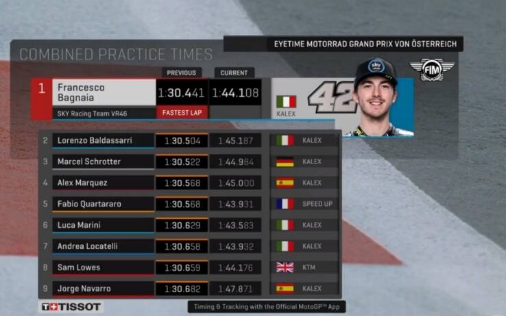 Come a voler marcare il territorio e mandare un chiaro messaggio a tutti: il pilota di riferimento in Moto2 è sempre lui, anche se in classifica il piemontese ora insegue Oliviera (davanti per soli due punti). Questo è Pecco, forte col gas e tosto di carattere. La seconda buona notizia riguarda Baldassarri, rilanciato dalla buona gara in Repubblica Ceca, finita a un passo dal podio, e secondo miglior tempo in FP1. La terza è una prima conferma di Luca Marini, dopo la vittoria nel gran premio precedente. Potrebbe esserci anche lui tra i contendenti al podio di domenica e lo conferma il sesto posto del mattino a meno di due decimi dal compagno di squadra e il terzo sull’acqua in FP2.