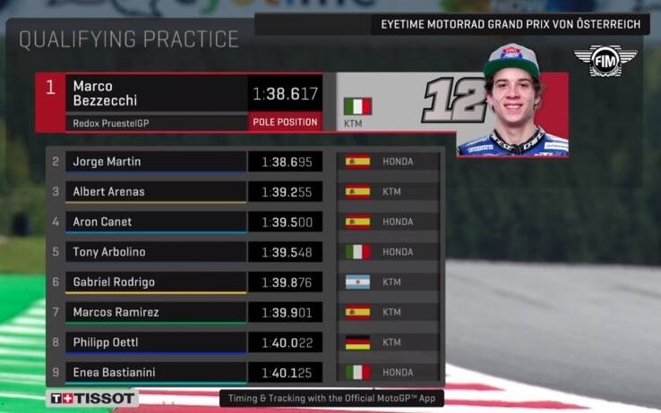 E il più tosto tra gli avversari è stato il sorprendente Martin, arrivato in Austria con un polso convalescente, operato appena una settimana prima. Si è risparmiato fino a sabato pomeriggio, Martin, ha dosato le poche forze che aveva, ha atteso il momento giusto, a fine qualifica, per spendere l’energia residua. E per soli 78 millesimi si è dovuto arrendere al romagnolo, il primo a inchinarsi per l’impresa che comunque resta e conferma il carattere tenace di questo orgoglioso madrileno. “Chapeau” , il gesto di rispetto di Bezzecchi a Martin, a qualifica ancora calda. Domani lui e Jorge si ritroveranno fianco a fianco, a giocarsi un gran premio forse determinate per il campionato: per Bezzecchi è la possibilità di allungare in classifica, per Martin l’occasione di riprendersi il ruolo che sente suo, di numero uno del mondiale.