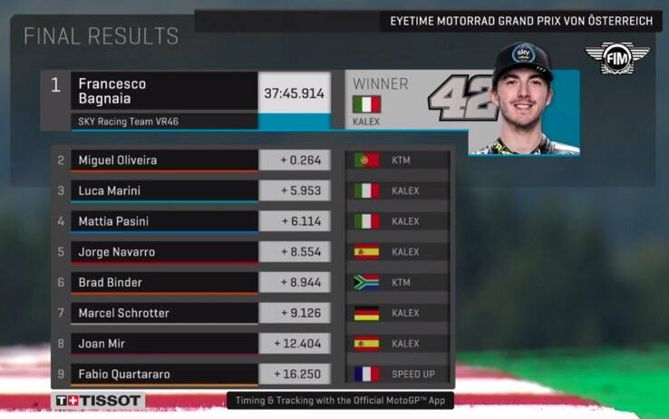 Bagnaia esulta, la sua quinta vittoria in Moto2 è forse la più bella, la più importante: «Ci ho provato all’ultima curva ed è stato fantastico per noi, in casa della Ktm». Nel frattempo, all’ultima curva cade Marquez, Marini è terzo e Pasini quarto. Tre piloti italiani nelle prime quattro posizioni ed uno, Francesco Bagnaia, di nuovo leader del campionato Moto2. Un campionato che non smette mai di regalare emozioni.