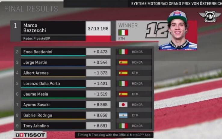 Attacco di Martin alla 3 e per la prima volta lo spagnolo passa in testa. Bezzecchi rende il favore in rettilineo, Martin di nuovo in testa alla 4. Bezzecchi risponde subito alla 5 e transita di nuovo al comando sulla linea del traguardo. Bastianini nel frattempo è rientrato e al penultimo giro i sei sono tutti insieme. Bezzecchi è spietato e getta sull’asfalto tutto il gas che gli rimane nel polso: inizia l’ultimo giro con 3 decimi di vantaggio, Masia attacca Martin per la seconda posizione. Anche Bastianini attacca Martin alla 6 e passa terzo ma non si accontenta. Grande bagarre tra i tre, mentre Bezzecchi ne approfitta e si invola verso la seconda vittoria stagionale. Bastianini riesce a sorprendere Martin in uscita dalla 9 e guadagna la seconda posizione mentre Masia va largo alla 10. L’Italia porta a casa una doppietta con Bezzecchi e Bastianini, Martin conquista un terzo posto che ha del miracoloso.