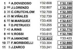 Marquez impressionante fino a questo momento: sta dando mezzo secondo di distacco a Michele Pirro, secondo nella classifica delle Libere 2