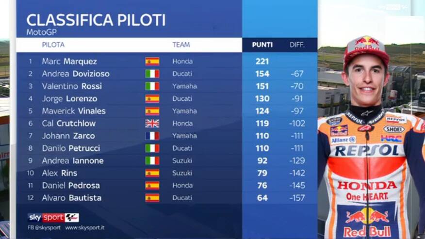 Il Motomondiale sbarca ad Aragon, una pista in cui gli spagnoli dominano ormai da sei anni sia in qualifica sia in gara. Per stessa ammissione di Marquez, Aragon è un circuito che il pilota della Honda ama in modo particolare, al punto da intitolare proprio a Marc la curva 10: "Non mi aspettavo un gesto di questo tipo, sicuramente sarà una bella sensazione passare per la prima volta su quella curva", spiega Marquez. Andrea Dovizioso, quindi, arriva a questo GP con sentimenti opposti. Da una parte c’è il grande entusiasmo suo e di tutto il team Ducati per aver vinto a Misano, davanti ai propri tifosi. Dall’altra parte, però, c’è quel distacco in classifica da Marquez che inizia a sembrare incolmabile. Sono 67 i punti che separano Marc, leader del Mondiale, da Andrea, secondo in classifica. "Marquez è vicino alla conquista del titolo? In effetti le possibilità per me di vincere il Mondiale sono molto basse, ormai non penso a vincere il titolo, sono concentrato sul migliorare i nostri problemi", ammette Dovizioso nella conferenza che apre la settimana di Aragon. "Siamo riusciti a migliorare alcuni aspetti raggiungendo gli obiettivi che ci eravamo fissati. Se vogliamo lottare contro la Honda l'anno prossimo per il Mondiale dobbiamo fare qualcosa di meglio, dobbiamo utilizzare questo finale di stagione per crescere, c'è sempre un margine di miglioramento. Forse al momento il margine non è molto grande, ma c'è sempre qualcosa da poter migliorare. Non abbiamo mai mollato, a metà stagione abbiamo capito che alcune cose non andavano bene, siamo migliorati in alcuni dettagli e adesso iniziamo a vedere i risultati, anche in piste dove non andavamo forte. Il nostro obiettivo è fare il massimo per questa stagione, ma anche per la stagione successiva". La Ducati ha dimostrato di avere un buon feeling con Aragon, come spiega anche Dovizioso: "Fin dai test di Misano abbiamo mostrato una buona velocità, i test ad Aragon sono andati bene. Abbiamo una moto migliore rispetto all'anno scorso, ma il consumo delle gomme condizionerà molto la gara, sembra che il meteo sarà buono quindi sfrutteremo al massimo ogni sessione".