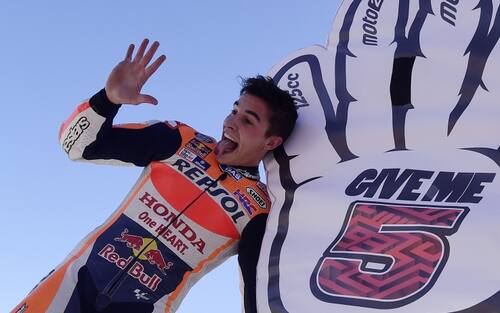 "Give me 5", è lo slogan che accompagna il quinto Mondiale vinto da Marquez con 298 punti. "Batti cinque", dice simpaticamente lo spagnolo ai suoi tifosi. Cinque è non solo il numero di titoli vinti di Marc, ma anche il numero di gare vinte dal pilota della Honda nel 2016 -