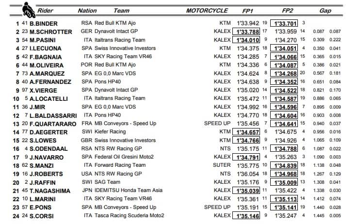 Classifica combinata Fp1-Fp2 Moto2 Australia 2018