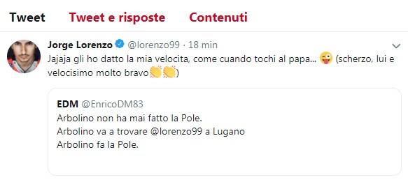 Sui social Lorenzo ha proseguito nei complimenti verso il pilota di Moto3. Nel commentare un post di un utente che sottolineava il fatto che Arbolino avesse fatto la pole dopo averlo incontrato a Lugano, lo spagnolo ha scritto: "Gli ho dato la mia velocità, come quando tocchi il Papa... (scherzo, lui è velocissimo, molto bravo)".